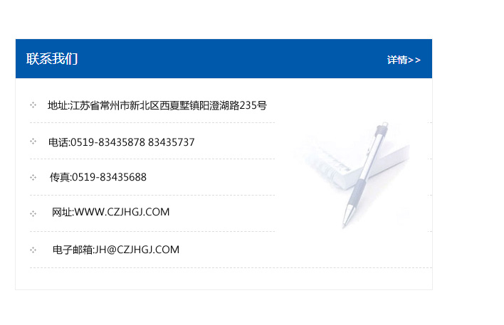地址:常州市新北區友邦商務大廈1幢16、17層  電話:0519-85101652  傳真:0519-85112595  郵編:213022  網址:www_cz-jiayue_cn.sprkjx.com  郵箱:xiajifengaa@163.com